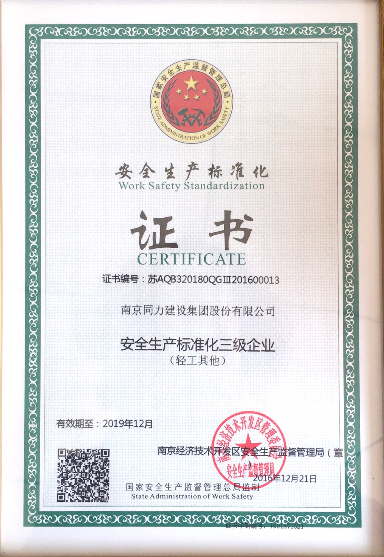 公司獲得《安全生產(chǎn)標(biāo)準(zhǔn)化三級企業(yè)》