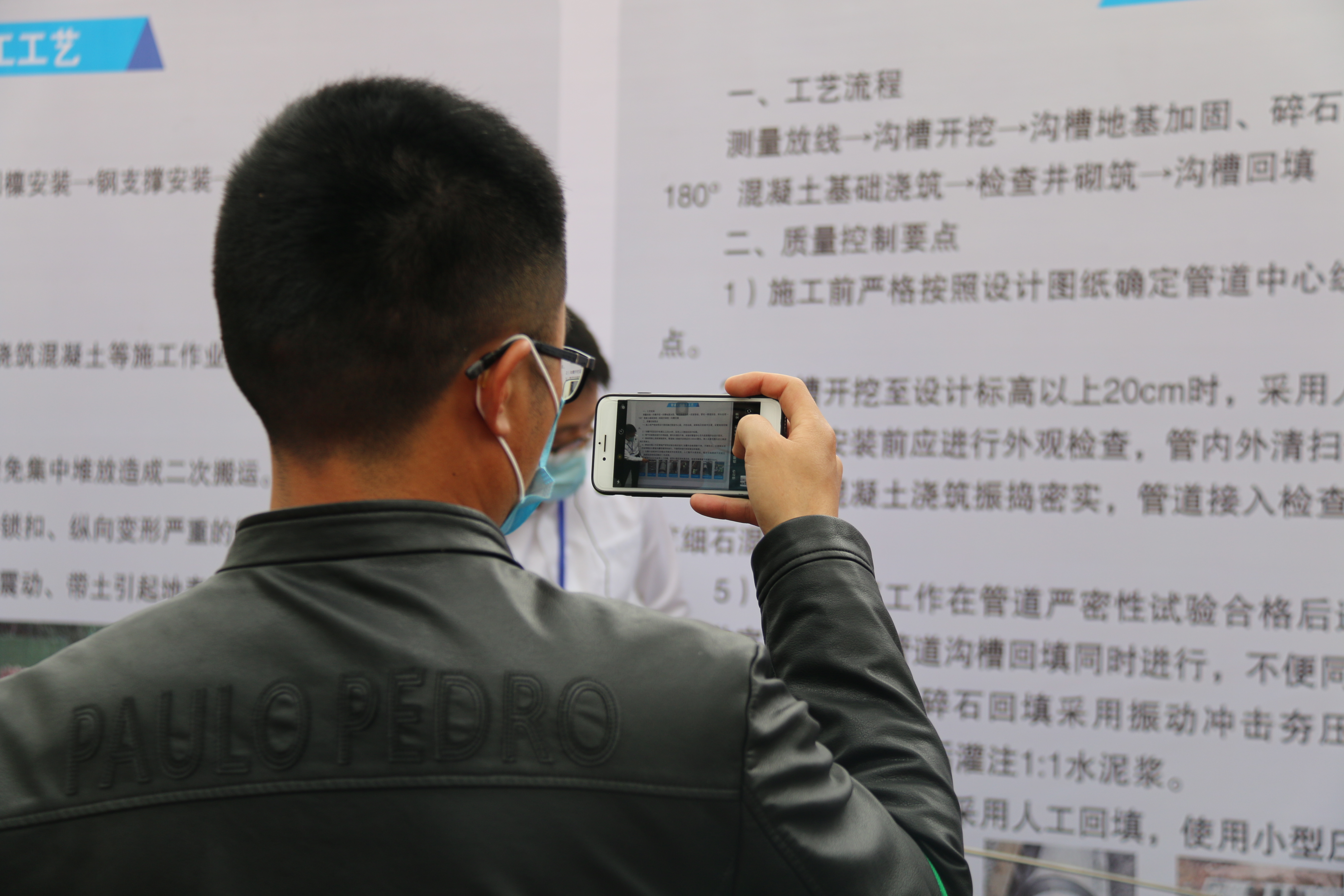 下午14點30分,觀摩人員陸續(xù)抵達展示區(qū),在解說員的引導下,有序按照既定路線對施工中多個管理亮點進行觀摩學習,各展區(qū)講解員為觀摩團提供了專業(yè)的分項解說。此次,同力建設精心布置的現場實體樣板區(qū)有管道施工管枕墊板、坡面路緣石、錯縫排版、可調節(jié)防沉降井蓋、人行道透水軟管、pvc排水管、不銹人行道盲道釘等,各樣板區(qū)都有統一服裝的講解員進行精彩的解說。參觀過程中,觀摩人員紛紛對先進的現場管理措施贊不絕口,拿出手機、相機等設備拍照記錄項目的亮點,并時不時向講解員提問交流學習。